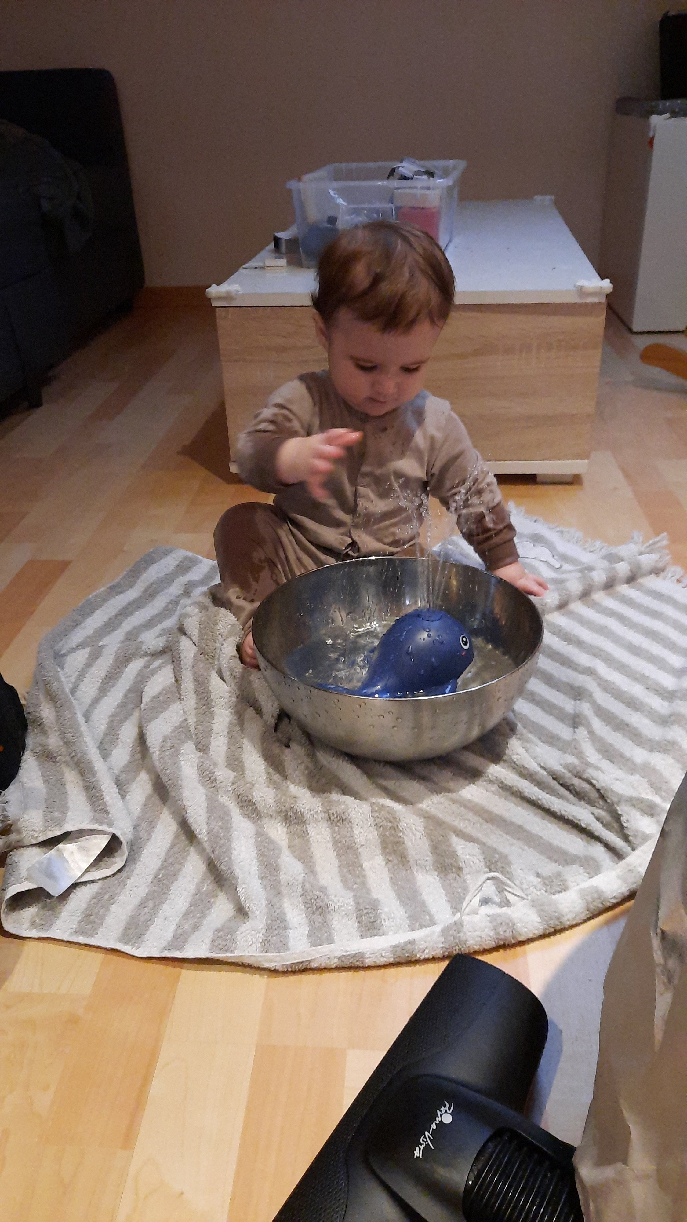 Mit dem Wahl durftest du auch gleich spiel gab zwar eine kleine überschwämmung und du warst pitschnass aber du hattest so viel spass. Dann gab es Mittagessen für uns ein rissen Sandwich und für dich Jogur. Spätistens jetzr müssen wir dich baden ach du sahst aus. Natürlich durfte der Wahl gleich mit zum Baden, du hattest richtig viel spass.